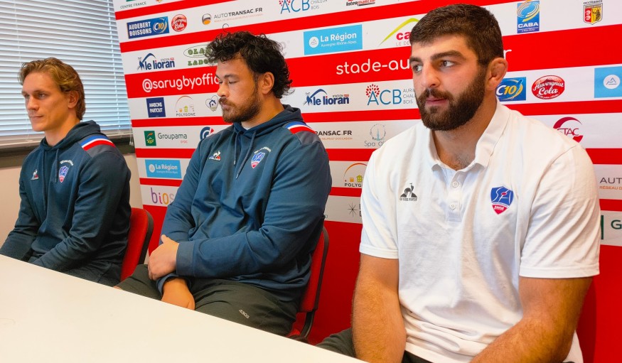 Légende photo : Juun Pieters, Dominic Robertson-McCoy et Alexander Burduli en conférence de presse d'avant-match ce mercredi matin.