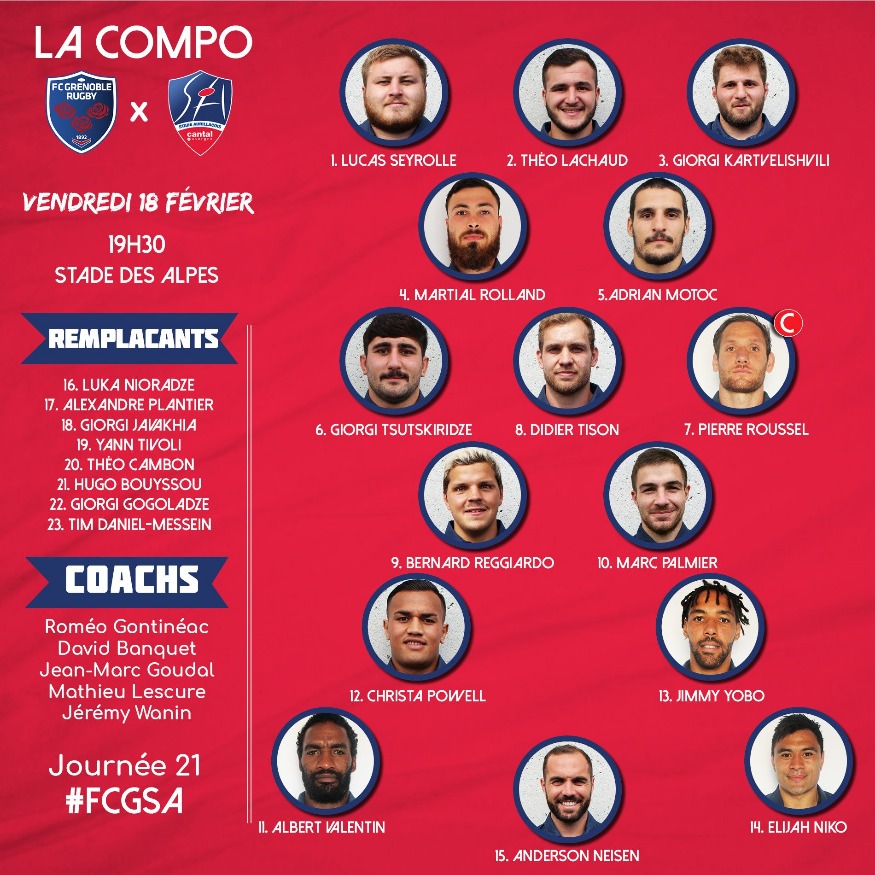 Pour ce déplacement à Grenoble, le staff aurillacois a choisi de miser sur la continuité en faisant confiance à la quasi-totalité des 23 qui se sont imposés la semaine dernière contre Colomiers (12-10).