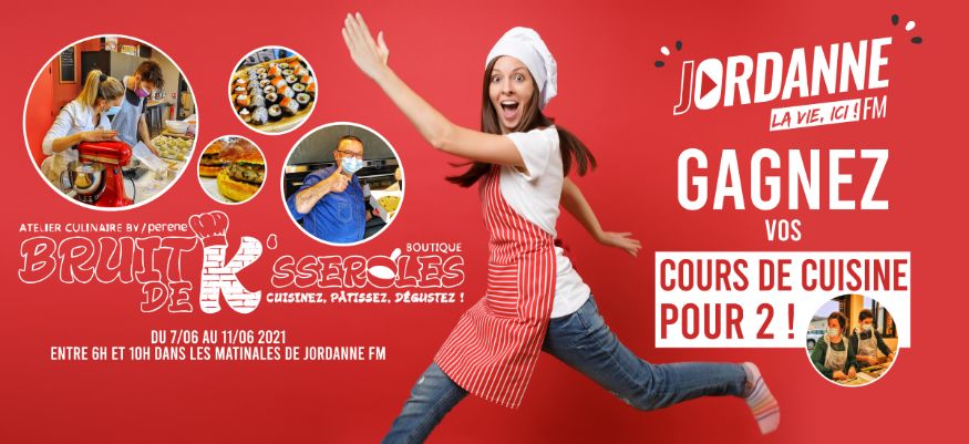 Jeu concours par tirage au sort parmi les inscriptions à ce jeu. Dotations : 1 atelier "Midi Chrono" pour 2 personnes (atelier cuisine de 12h15 à 12h45, puis repas sur place + dessert et café offerts) à gagner chaque jour, du lundi 07 au vendredi 11 juin 2021. Les coordonnées des gagnants seront transmises au partenaire (Bruit de K'sseroles); les gagnants pourront réserver leur atelier au 0471485832 à partir du 11 juin et se présenter le jour de la réservation avec carte d'identité. Dotation valable jusqu'au 31/12/2021, non remboursable et non échangeable. Jeu gratuit sans obligation d'achat.