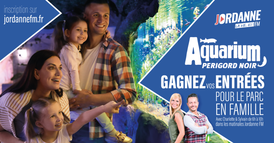 Jeu concours par tirage au sort parmi les inscriptions à ce jeu. Du 03/04/2023 au 07/04/2023, chaque jour, 4 entrées pour l'Aquarium du Périgord Noir. Les billets sont envoyés par mail aux gagnants, par Jordanne Fm. Bons non-remboursables, non-échangeables et non fractionnables. Valables jusqu'au 31.12.2023. Jeu gratuit, sans obligation d'achat.