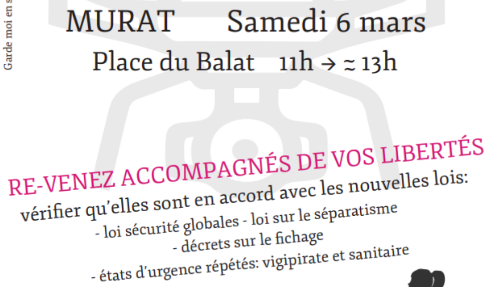 Un collectif s’est constitué dans les environs de Murat pour rejoindre ce mouvement national. Après le rassemblement du 30 janvier, il invite de nouveau les Muratais, les gens de passage et des alentours, à une nouvelle "Manifestive" : un rassemblement pour les libertés, la nature et les transports tout doux, ce samedi 6 mars de 11h à 13h, place du Balat à Murat (Cantal).