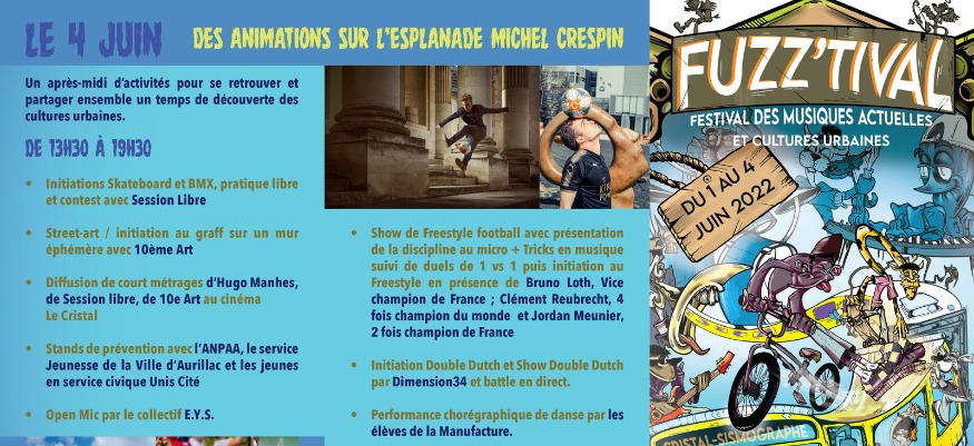 Ce festival, c'est aussi l'occasion de promouvoir les cultures urbaines. Dans ce cadre, plusieurs activités sont proposées sur la journée du 4 juin. L'esplanade Michel Crespin accueillera sur la journée du samedi, l'association Session Libre pour des initiations au skateboard et au BMX.