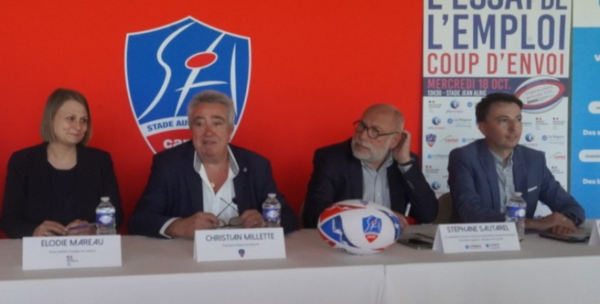 Légende photo : de gauche à droite, Dominique Beaudrey du service emploi et formation du conseil départemental du Cantal, Elodie Mareau sous-préfète du Cantal, Christian Millette président du Stade Aurillacois, Stéphane Sautarel sénateur, et Sébastien Faure-Rouquié directeur territorial Cantal du Pôle emploi.