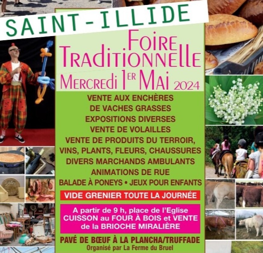 Légende photo : le programme de la foire traditionnelle du mercredi 1er mai 2024 à Saint-Illide.