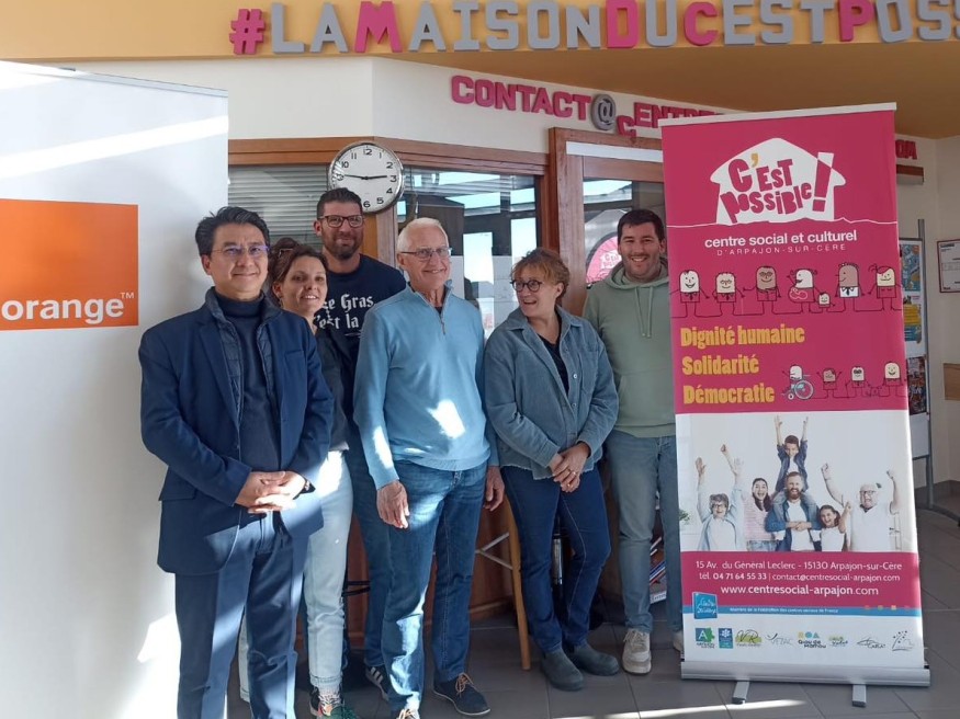Légende photo : au 1er rang, Anthony Nguyen, directeur des relations institutionnelles pour Orange, André Peyronnet et Claudine Fley, président et directrice du centre social et culturel d'Arpajon. Au 2nd rang, les animateurs du centre, formés aux ateliers, qui animeront l'afterwork.